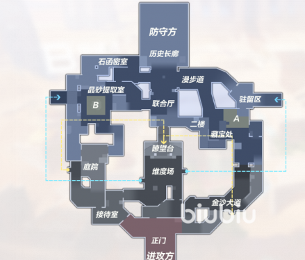 此外防守方在来到地图的过程中,也没有什么弯弯绕绕,也没有什么遮挡,而进攻方来到点位的路,则多是弯弯绕绕的路,路程中的遮挡物也很多,这就让其在进攻的时候会受到一些限制,很容易被防守方提前架点针对,这就是第二张爆破图空间实验室了。