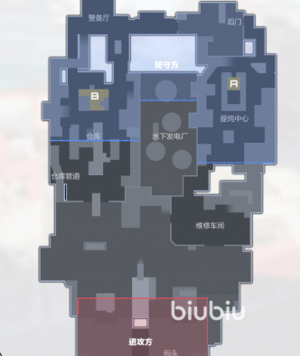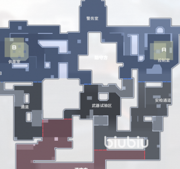 最后一张图404街区,这张图的话是游戏中最为简单明了的一张图,图的区域除开两个复活点以外就五个,这五个区域两两相连,b点连着下面的通道,a点连接着下方的安检通道,中间那一个武器试验区连接着两边,这让这张图的地形变得极其的简单,是一张比较纯粹的战斗类型爆破地图。