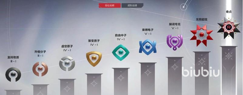 游戏的最高段位是奇点。至纯物质是最基础的段位,三颗星就能晋级,匹配的对手难度比较小。升格分子是段位的二阶段,难度也比较低。虚空原子相对来说会有一点难度的提升,是段位的第三阶段,4颗星可晋级。