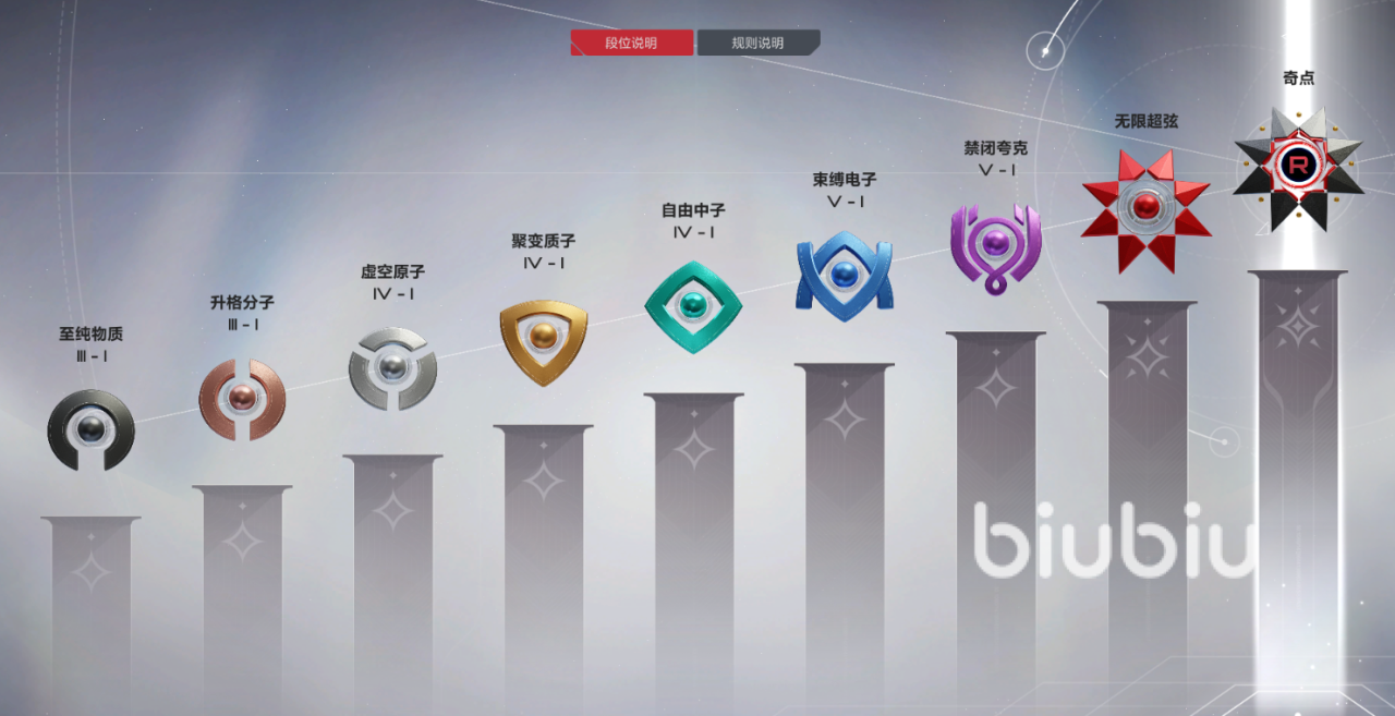 段位有着至纯物质到奇点的划分,具体的划分情况可以直接参考下图,想要晋升需要去打排位,每一局的排位比赛结束后会根据胜负以及当局表现情况,来增加或者是减少积分。