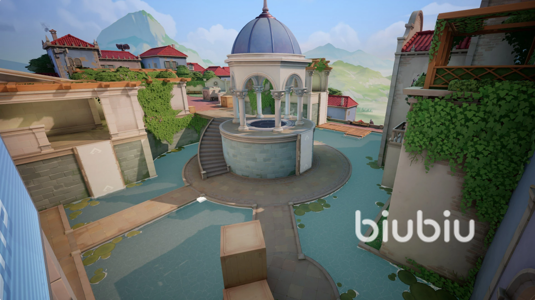 比较好的一个防守点位就在拱桥后面,侧着身子就能看到前方对手的情况,这个区域也是比较高的突入点,进攻方如果直接选择飞进来,可以在桥后面守株待兔,瞄准他们,毕竟飞行必经这里,等他们落点就能直接攻击,桥下面还能看到右边的钟楼,这里也经常有人绕后,这里也需要重点防守。