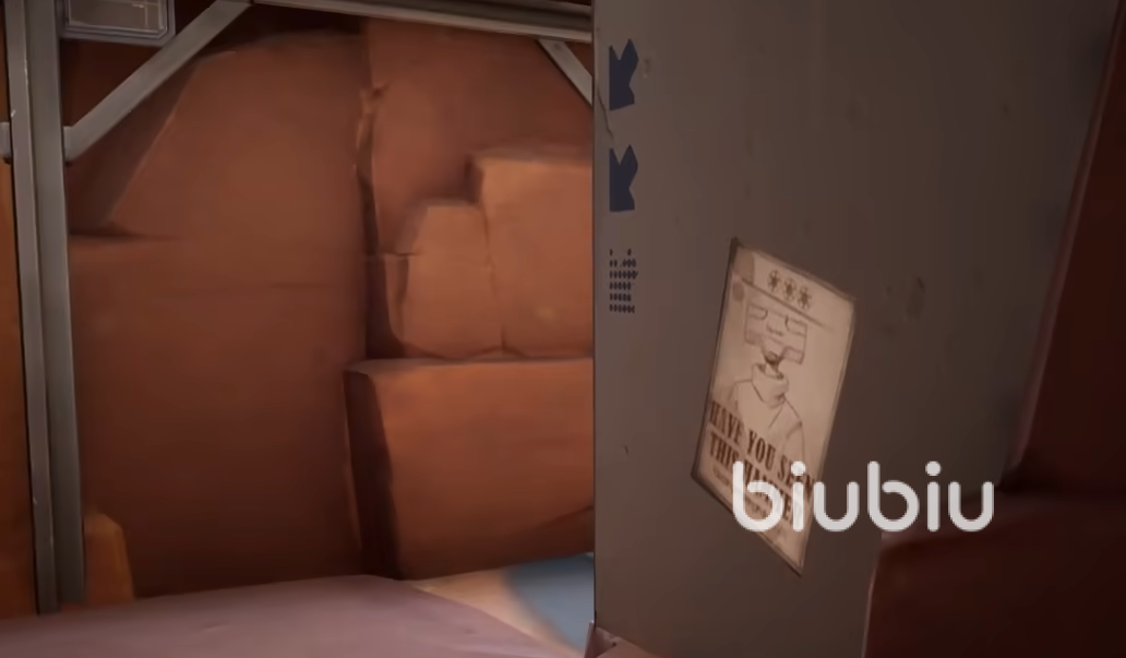 继续往里面走能看到叉车后面的海报,座椅位置上有一个超大号的车车玩偶,继续向着前方前进,能看到一堆车车玩偶在围着一个晶体,回头能看到一张海报,回到复活点的二楼在地面和角落的箱子中也有着同样的海报。
