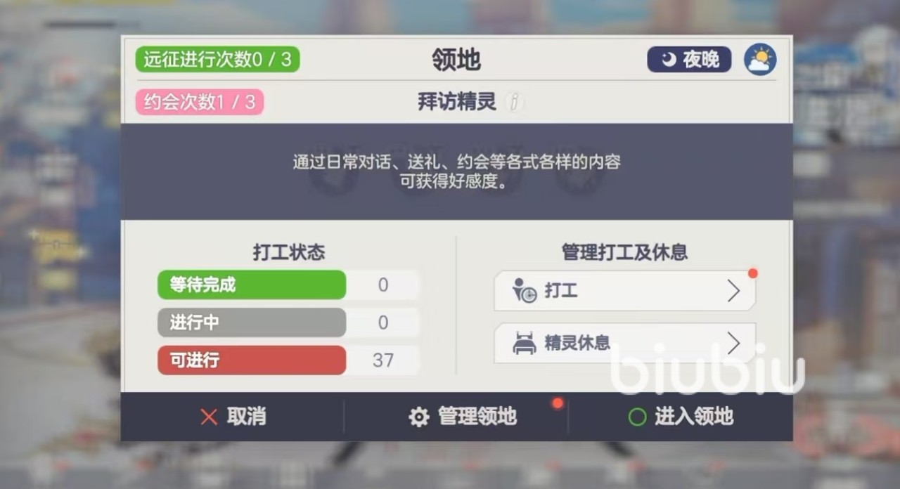 精灵打工可以稳定产出领地币,在领地商店中兑换限定外观、技能书或者是突破石等实用道具。有一部分打工岗位还可以产出抽奖扭蛋,这是获取精灵专属好感道具的核心常规途径,所以能够拿到扭蛋的收益,是打工的最佳选择,建议优先给精灵分配能够产出扭蛋的打工岗位,这样既可以完成日常打工,还可以顺带收集好感道具,加快精灵好感度的养成。不同打工岗位会出现相应的奖励,但是要注意,这些出现的奖励指的是白天打工的基础值,在夜晚打工获取的领地币为两倍。