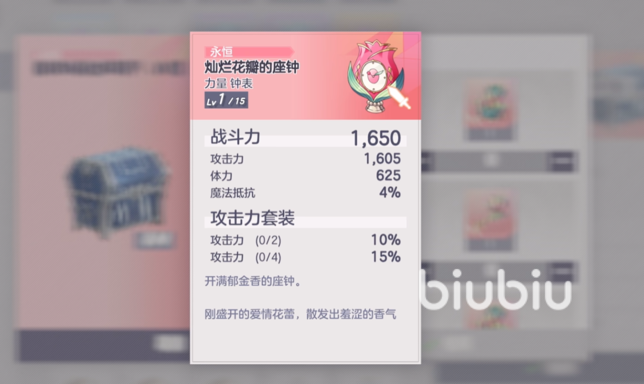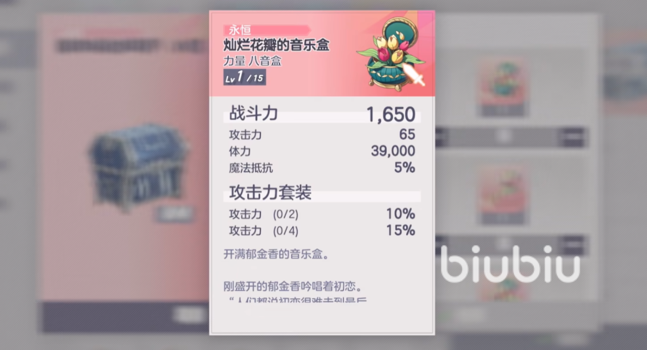 另外还有灿烂花瓣的音乐盒,同样是力量类型的首饰,用了之后可以获得高达三万九千多的体力加成,以及高额的魔法抵抗力,可以间接增加角色的生存能力,让人无法轻易忽视。但是这件饰品所带来的单体防御属性很强,要是自己的主C已经有饰品了,那就可以将它交给一些防御类型的坦克角色,毕竟单件所带来的生命和防御加成更为强悍!