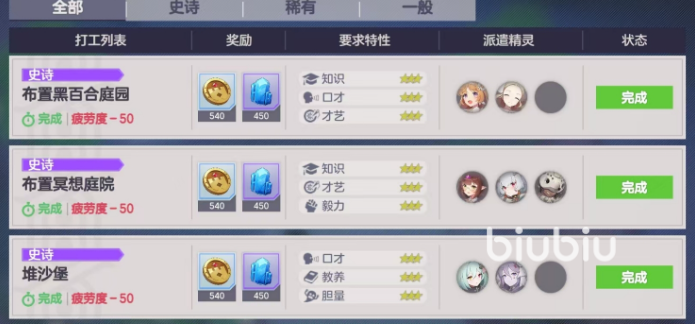 精灵委派打工任务一般分为史诗、稀有和3级,单次任务所消耗的疲劳值是相同的。在做任务时优先完成史诗任务,其次是含扭蛋球等一些限定道具的较为稀有的任务,最后是一般任务。精灵疲劳值满了之后,大家可以放置休息栏里进行自动回复,满值时是无法放入的。