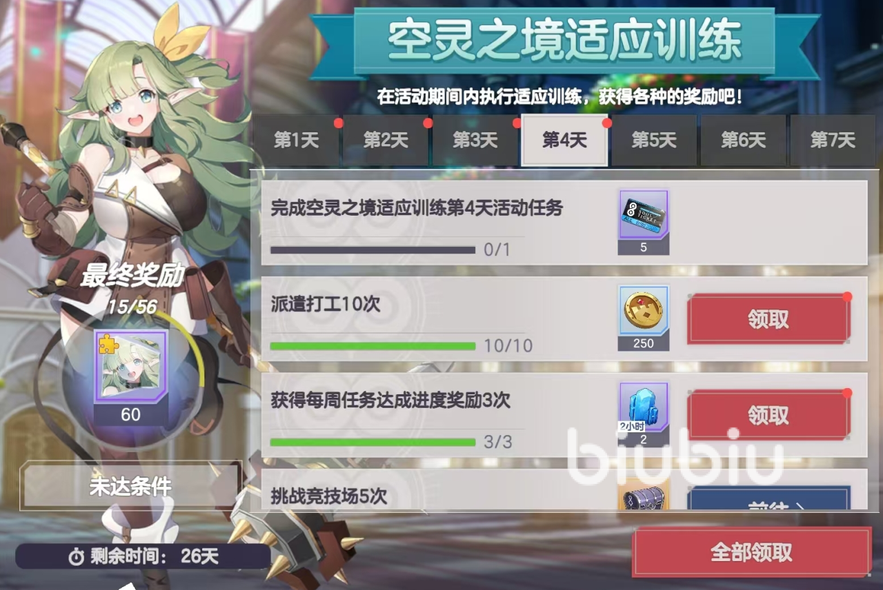 【空灵之境适应训练】每天都会解锁新的活动任务给玩家,共计7天,每项任务完成后能领到很多基础奖励。当所有任务都完成后,还能领取精灵【达芙妮】,是开荒期必做任务之一。