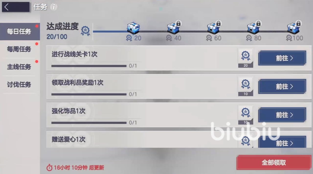 完成日常任务能积累积分进度,待积分达到目标值后可领取积分奖励,每日6点重置进度。同样的,周常任务也采用的是积分值,在完成日常任务时可顺道完成,每周一6点重置进度。