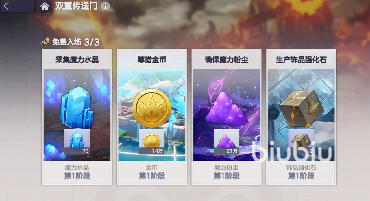 每天能免费入场3次,不同副本在刷取时可获得的资源也不一样,能刷取到【魔力水晶】、【金币】等资源,玩家可根据自身缺少的养成资源,选择对应副本进行刷取。