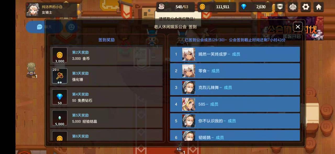 1.加入公会后可以进行每日签到,7天奖励有钻石、金币、强化锤、经验结晶。