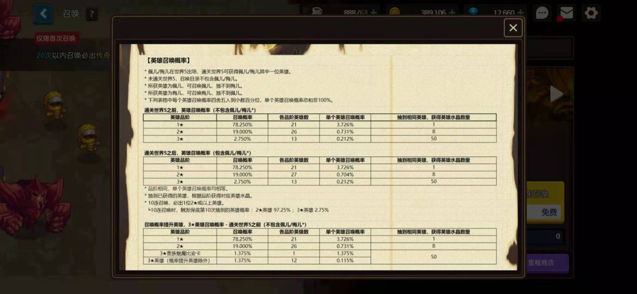 通关世界五之前,我们百分百召唤不到佩尔以及梅儿这两个英雄,但是通关世界5后会自动赠送一个。我们有百分之78.250的概率抽到一星英雄,百分之19的概率抽到二星英雄,百分之2.75的概率抽到三星英雄,所以换句话说。我们只要选择抽取的话,就是百分之百可以抽取到英雄的,就是品阶的不同而已。