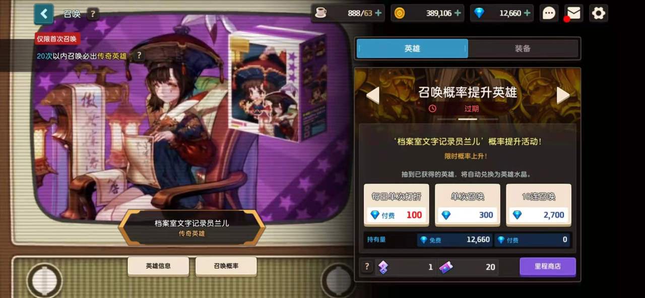 相信一星的英雄并不能满足大家,各位自然想要获得强力的传奇英雄去帮助大家披荆斩棘。其实我们只要召唤满二十次之后,自然就可以百分百召唤到传奇英雄了。但是我们第一次抽到传奇英雄之后,下一次想抽到传奇英雄,就只能靠运气了。