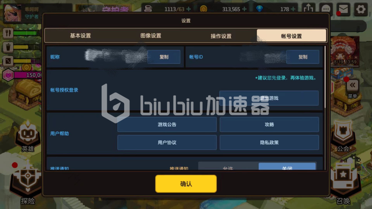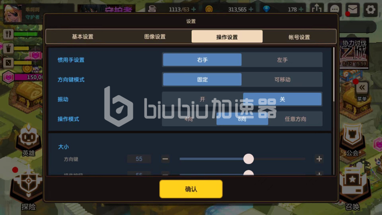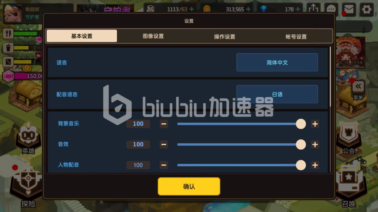 玩家进入游戏后,可以在主页面中看到召唤,英雄,探险等各种场景,选择右上角的设置进入设置详细信息。其中包括基本设置,图像设置,操作设置和账号设置。在基本设置中可以通过配音语言选择不同的语种进行切换,还可以对游戏中的音量,音效进行控制设置。在操作设置中通过对人物的移动方式和大小进行设置。