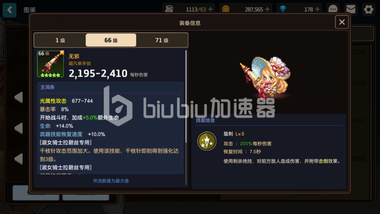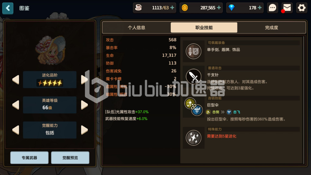 淑女骑士-拉碧丝英雄,他的初始品阶就是三星,属于光属性的战士英雄,在职业技能中可以看到在攻击力和生命值总处于超高位置,可以佩戴单手吉剑,盾牌或饰品,通过千支针技能进行攻击可以使敌人造成伤害,随着不断的持续攻击,可以对拉碧丝进行升品强化。拉碧丝的连锁技能使巨型伞,通过此技能的击倒关联到击飞。投射出巨型伞,通过巨型伞对敌人造成360%的伤害。