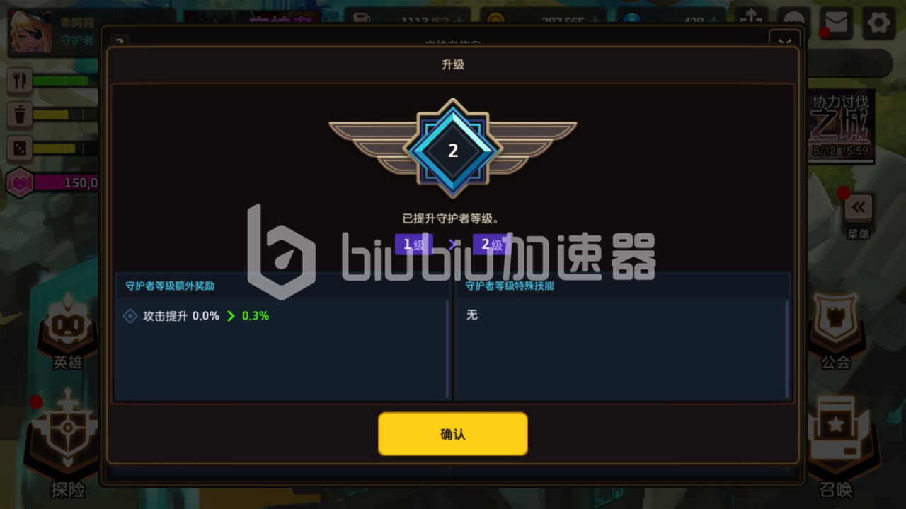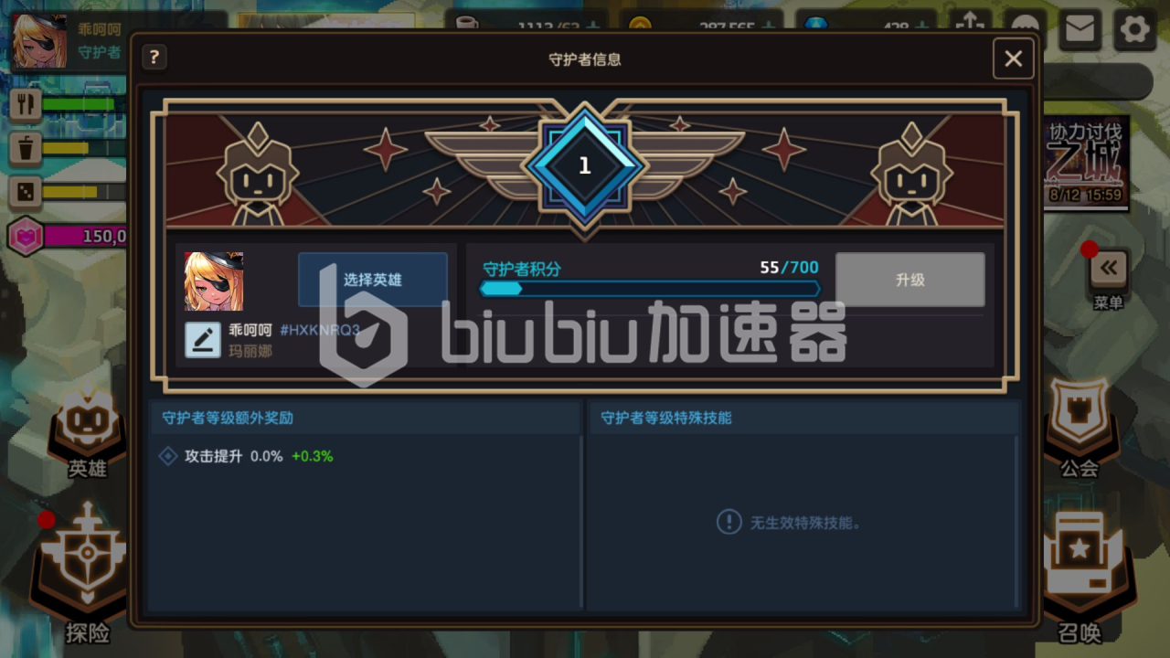 在左下方可以看到守护者等级,可以收集守护者积分来提高守护者等级,随着守护者等级的不断提高,英雄的实力也会越来越强。升级守护者等级所使用的积分可以通过开启守护者基地模式后,自动通过时间积累获得守护者积分,当收集积分领取成功后即可提升守护者等级。当守护者等级不断提升后,达到守护者等级上限后,已经获得的多余的守护者积分可以兑换成金币,积分和金币通过50比1的形式进行兑换。