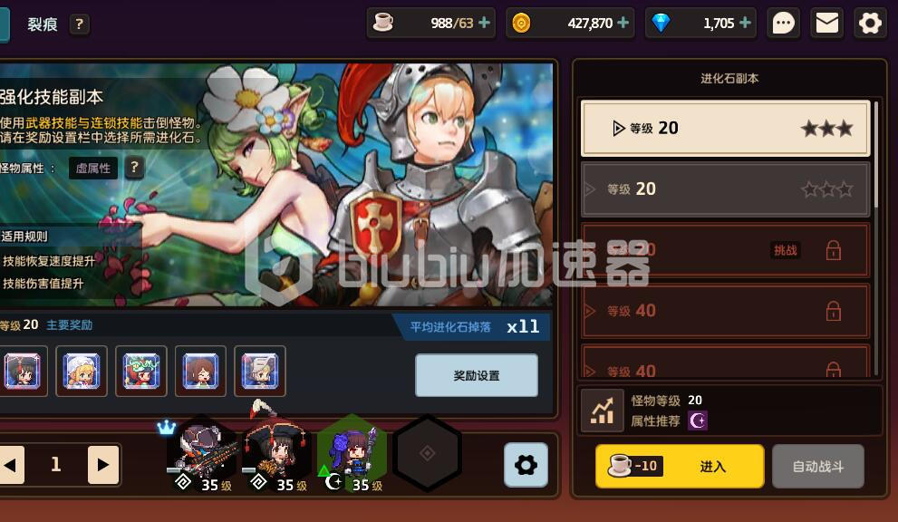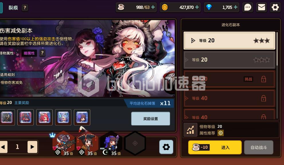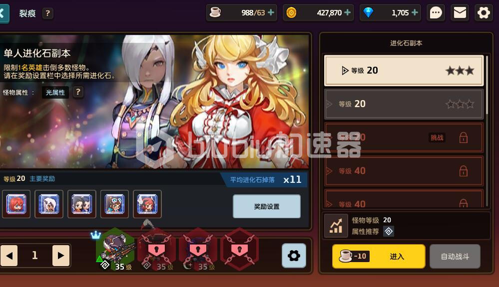 第三个进化石副本的难度最高,因为在该副本当中的所有怪物都拥有伤害减免的优势属性。玩家们必须要准备一套更加强大的阵容去应对。同样的,获胜之后可以得到大量进化石。