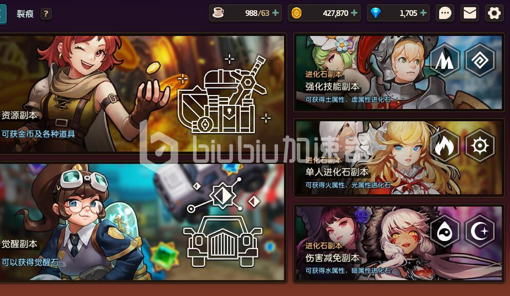 首先,玩家们可以直接从探索界面当中进入裂痕。在裂痕模式当中,玩家们就可以看到非常丰富的副本类型,包括了大量的资源副本和觉醒副本,以及三个不同类型的进化石副本。