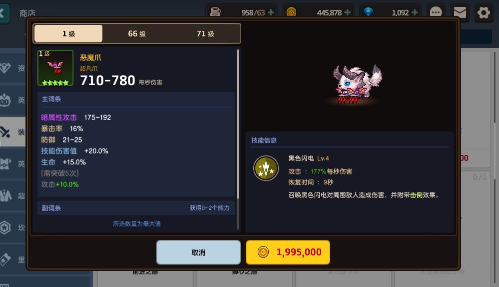 第一种非常强大的近战武器,也是白兽的专属武器,名为恶魔爪。恶魔爪在近战当中不仅可以对敌人造成高额的暗属性伤害,当白兽装备之后,还会直接获得黑色闪电技能,对敌人直接造成范围伤害。