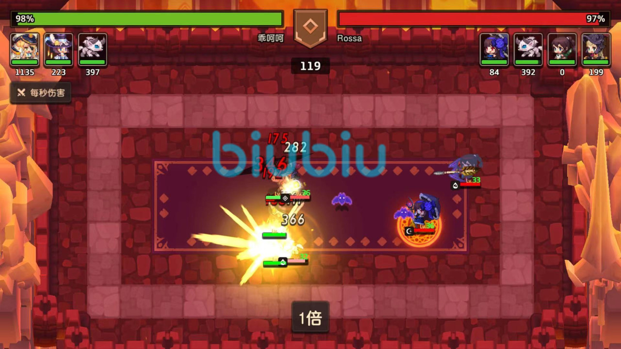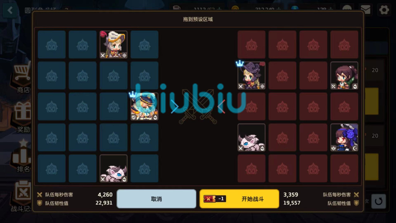 在圆形角斗场中,玩家可以通过选择不同的队伍进行开始战斗。在120秒内使对方所有的队员失去战斗能力,直接获胜,如果在120秒内未分出胜负,那么胜于生命较多的一方获胜,当获胜后可以获得战斗勋章奖励。战斗勋章在商店中可以兑换各种不同的道具,其中包括饰品道具。