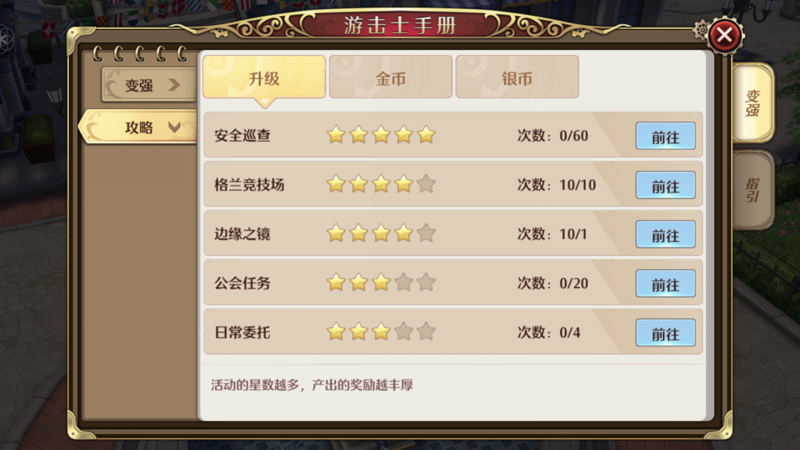 如果我们想要知道每种活动获得经验的多少,我们可以点开游击士手册,选择攻略——经验。就可以看到所有高经验任务,并且还进行获得经验高低排序,星星最多的活动获得的经验也最多,我们应优先完成。