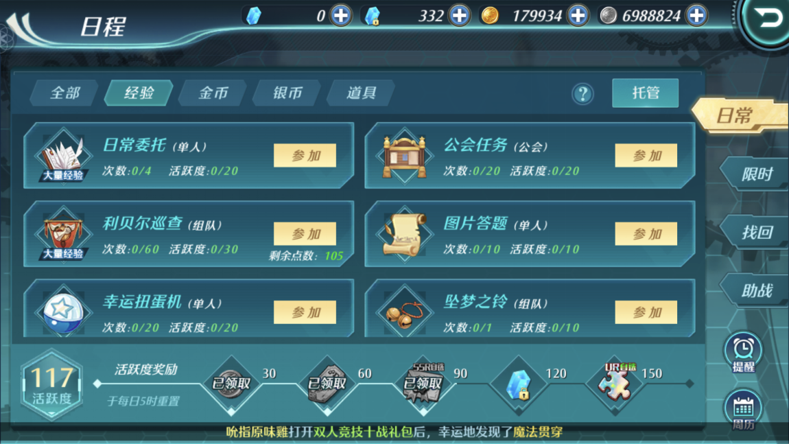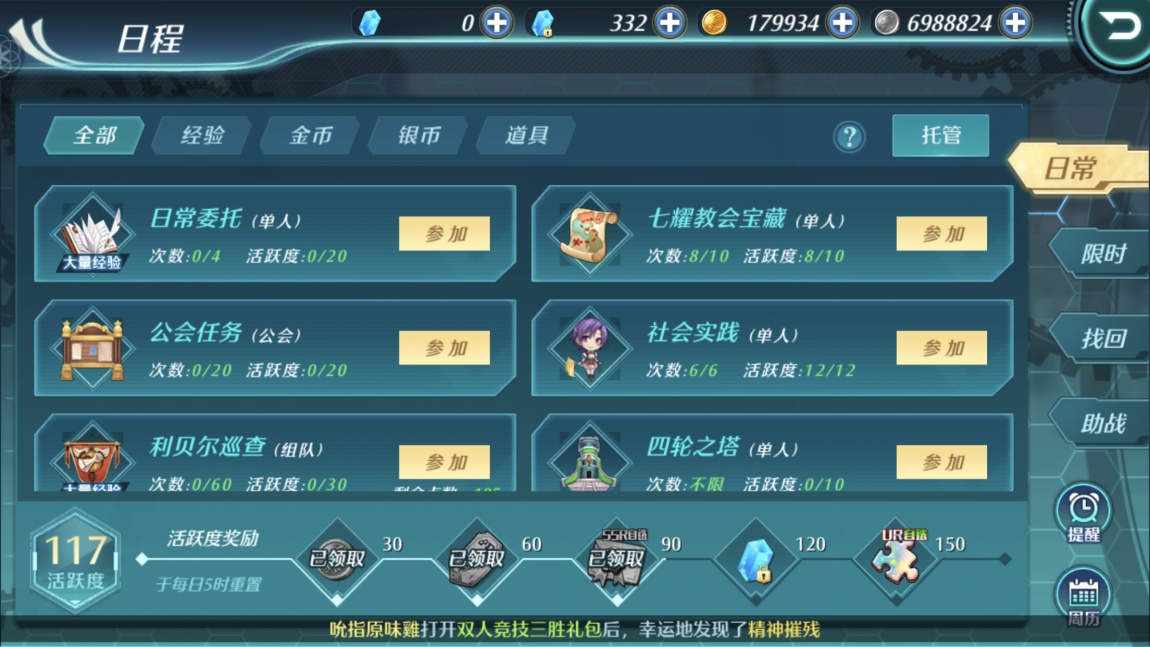 日常任务有日常委托、教会宝藏、公会任务、社会实践、利贝尔巡查、四轮之塔等等。则限时任务有公会寻宝、野外boss、地区巡逻、紧急军情等。限时任务只能在特定的时间段进行。