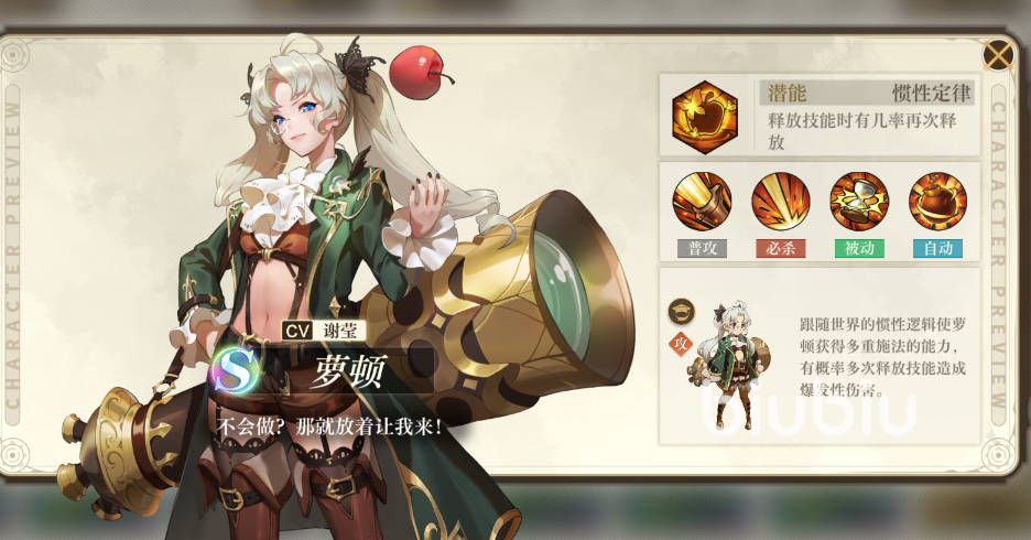 这个角色是一个攻击型的角色,她可以在给前方目标造成高额单体伤害的同时,眩晕目标,让其无法动作,给队友争取更多的输出时间。