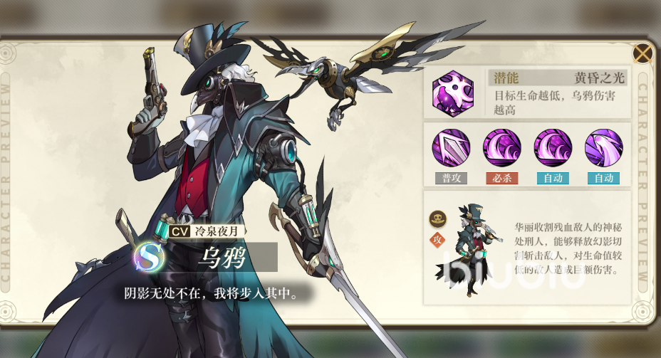 乌鸦这个角色,相信玩过这款游戏的人都知道他的伤害是很高的,并且他的必杀技能“终结”还可以直接释放幻影突击到敌人的面前,对在他攻击范围内的敌人造成总计高达1080%的伤害。