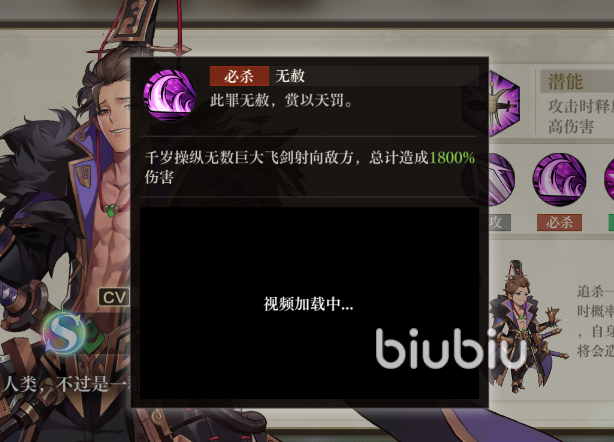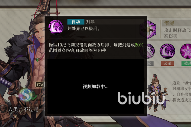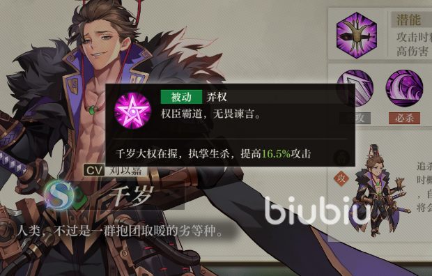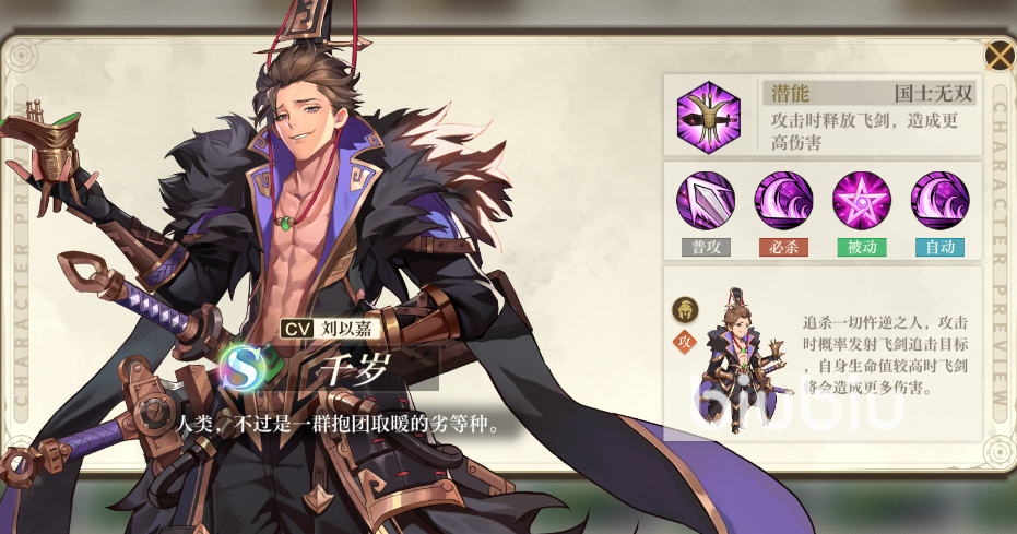 然后是他的自动技能“判罪”,它可以让千岁操纵10把飞剑攻击地方后排,并且每把剑都可以对敌人造成20%的贯穿性伤害,接下来是他的被动技能“弄权”,这个技能可以让千岁的攻击提高16.5%,打出更高的伤害来,最后是必杀技能“无赦”,它可以让千岁用无数的剑,飞射敌人,并且一共可以对敌人造成高达1800%的巨额伤害,是一个非常强大的技能。