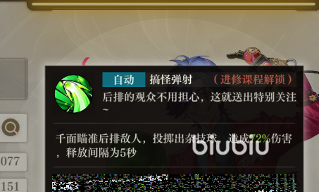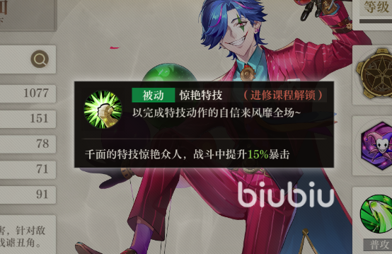 他的被动技能叫做“惊艳时刻”,这个需要玩家进修课程来进行解锁,它的效果是可以在战斗中为千面提高百分之十五的暴击,而他的被动技能则叫做“搞怪弹射”,也是需要进修课程才能解锁,可以瞄准后排的敌人,精准投掷杂技球,并对目标造成百分之七十二的伤害,每五秒可以释放一次,再加上他本身的高暴击和高爆伤,非常建议大家培养起来。