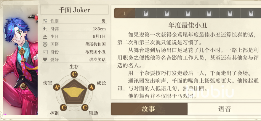 千面,也叫千面Joker,是一个a级角色,我们先来看看他的面板,从下图我们可以看出,他的成长和伤害都是很高的,特别是伤害,达到了A+,这在一个a级卡身上是不常见的,不过他的生存、控制和辅助就比较弱了,可以搭配一个防御高的一起战斗。