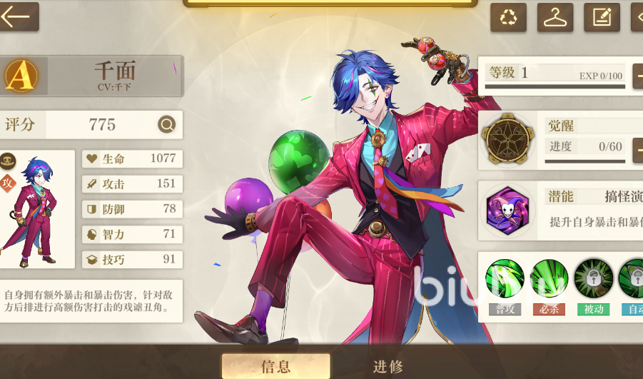 接着是前面,这个角色在a级卡里可以说是排名非常靠前,自己暴击跟爆伤都很不错,再加上一个可以提高这些伤害的潜能,只能说,他培养起来了甚至可以打过s卡。