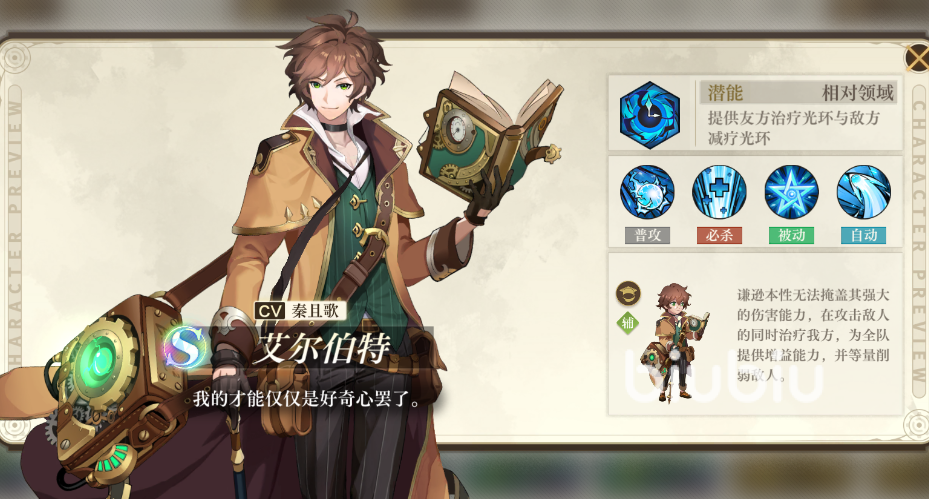 接下来是艾尔伯特,他的潜能叫做“相对领域”,可以恢己方队友提供治疗,加一定的血量,而且还可以使敌方减疗,给队友提供更高存活率的同时还提供了更好的输出环境,因为一般情况来说,战斗阵容最好是一个输出、一个防御、一个治疗,这三个刚好就可以放在一个队伍里,如果开局就有这三人,那么培养起来以后,可以说玩家直接自动战斗到游戏中期都是没问题的。