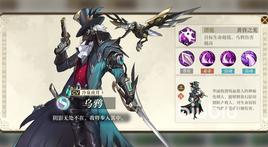 下一个是乌鸦,他的潜能叫做“黄昏之光”,当他所攻击的目标血量越低,他的伤害就越高,是一个输出型角色,非常适合新手用来推图,再配合上绫一起,前期甚至玩家可以放心的挂机战斗。