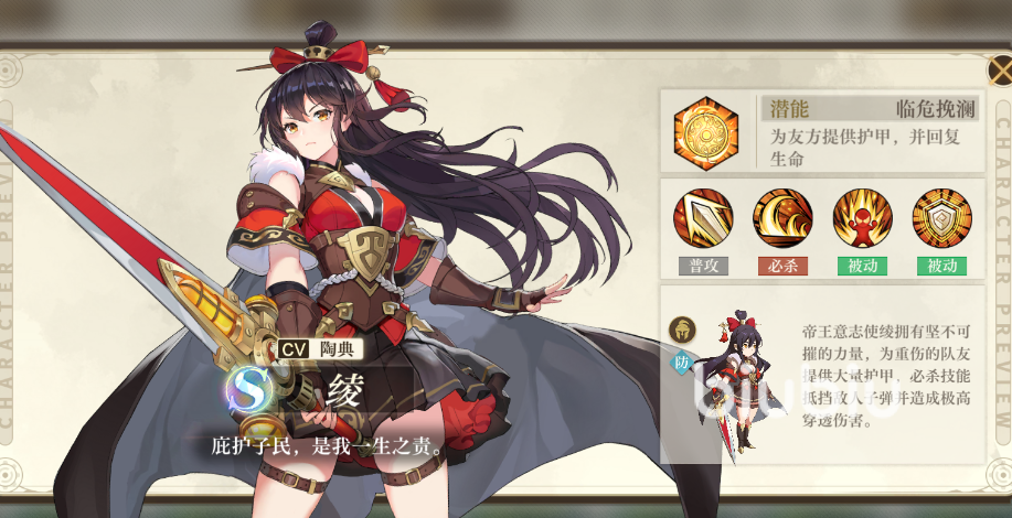 首先推荐的角色是绫,她的潜能叫做“临危挽澜”,可以为己方队友回复血量,并且提供一个护甲,是一个防御型的角色,有她在只要自己在跑的时候主要不要全部吃到技能,基本上不用担心队友会被打死。