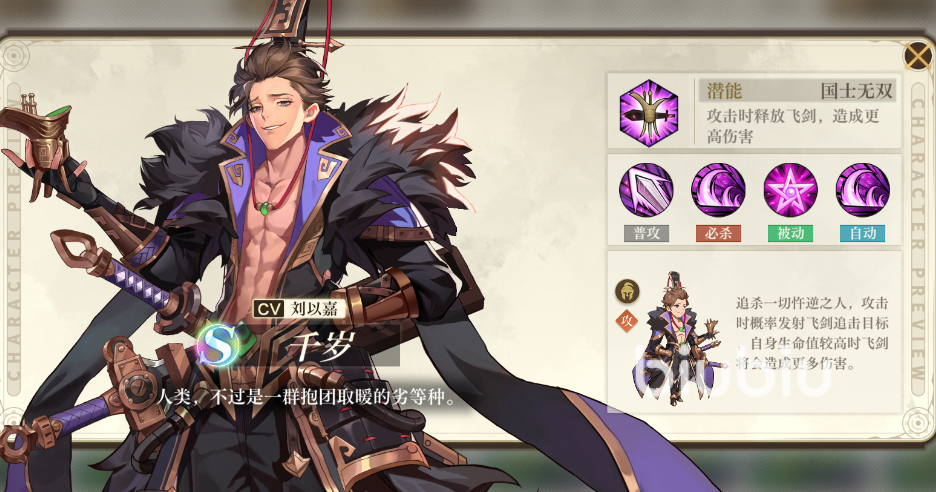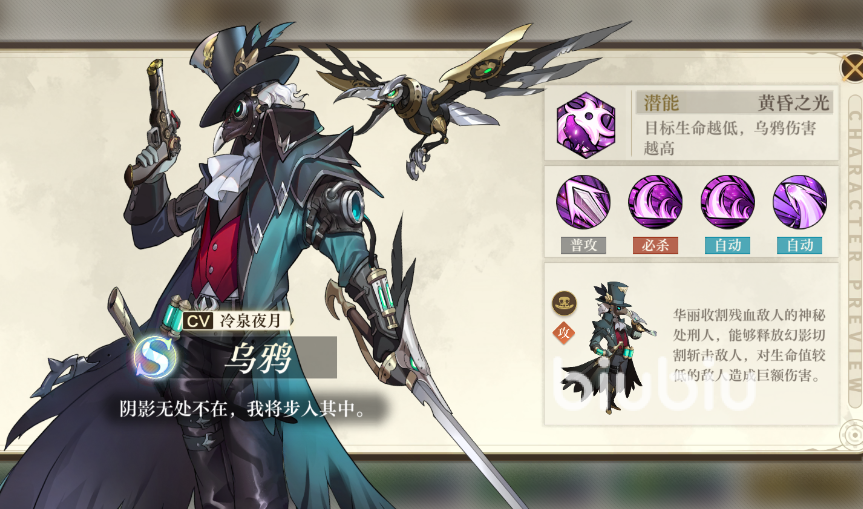第一个推荐的当然是游戏内的强力输出角色——乌鸦了,他有一个叫做“致残”的自动技能,可以放出3道剑刃对敌人进行追踪并造成一定的伤害,以及放出3只机械鸟攻击敌人的“处刑”,在战斗中非常好用,然后是千岁,这个角色跟乌鸦有点相似,他的自动技能是可以用飞剑射杀敌人后排的“判罪”,伤害也是非常高。