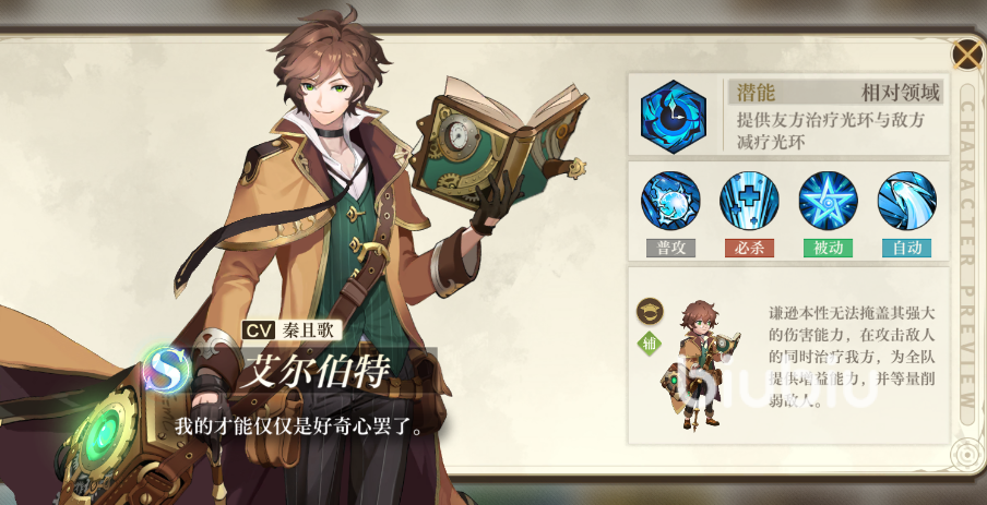 最后推荐的是一个辅助角色——艾尔伯特,他的自动技能“宇宙常数”可以为己方全体人员回复艾尔伯特自身攻击24%的血量,并且对敌人造成15%的输出伤害,是一个能打能奶的辅助。