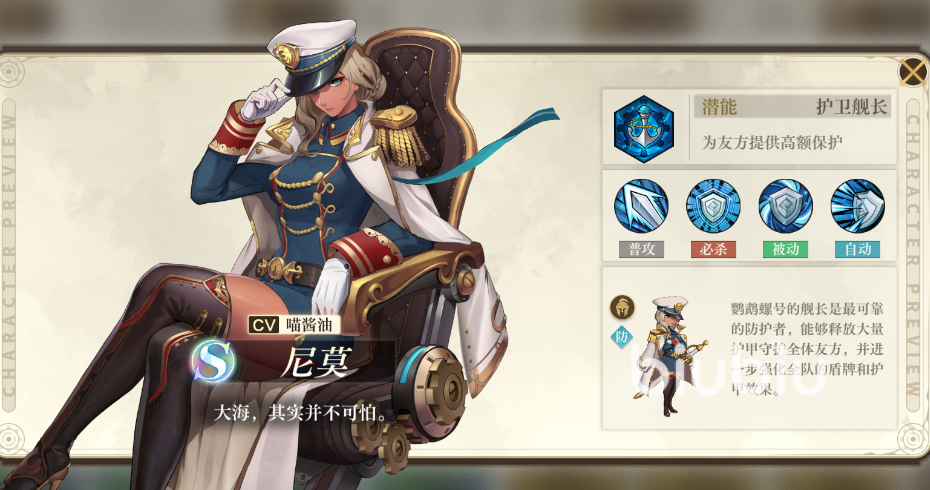接下来给大家推荐的是一个防御角色——尼莫,她的自动技能“孤独信念”可以对敌人造成高额伤害,并且为己方血量最低的一个队友释放一个自身生命20%,持续6秒的护甲。