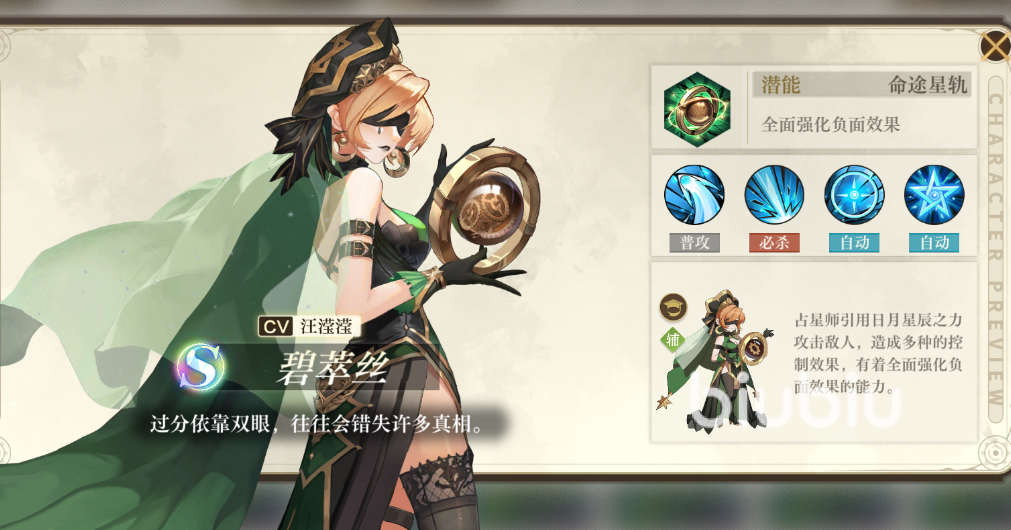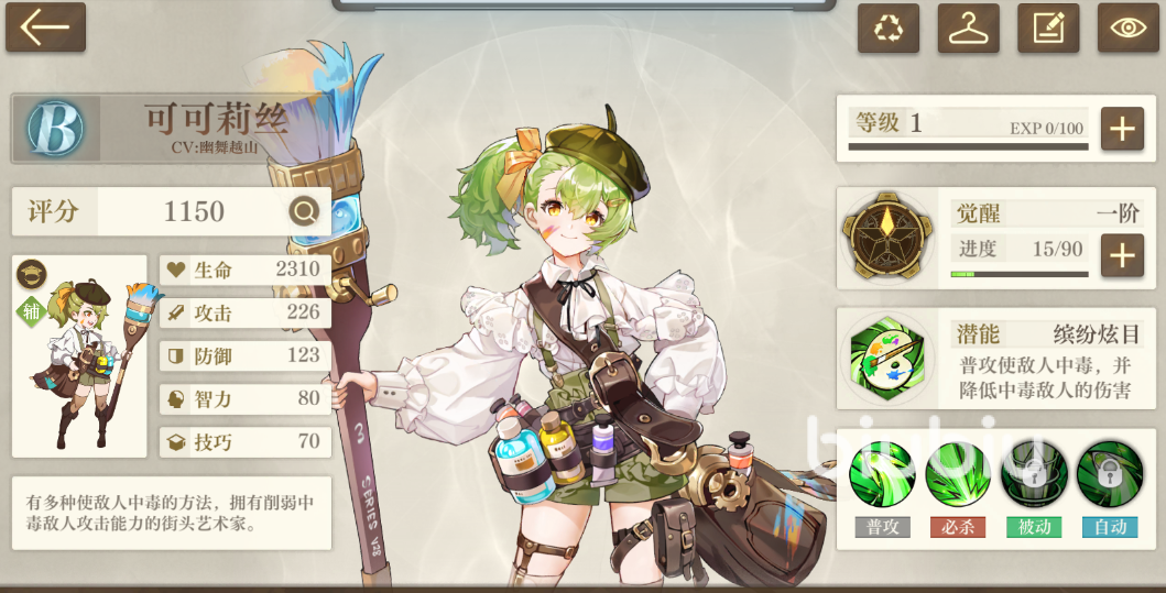 再然后是可可莉丝,她是队伍里唯一一个b级成员,但是非常好用,她的潜能“缤纷炫目”可以让自己的普通攻击使目标中毒,并且降低此目标的伤害。