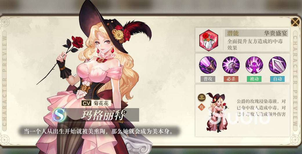 在小编搭配的毒队里,阵容由玛格丽特、碧萃丝、星纭、可可莉丝和莎美组成,接下来小编就来为大家介绍一下他们吧,首先是玛格丽特,她可以让被自己击中的目标中毒,并且对对方造成额外的持续中毒伤害。