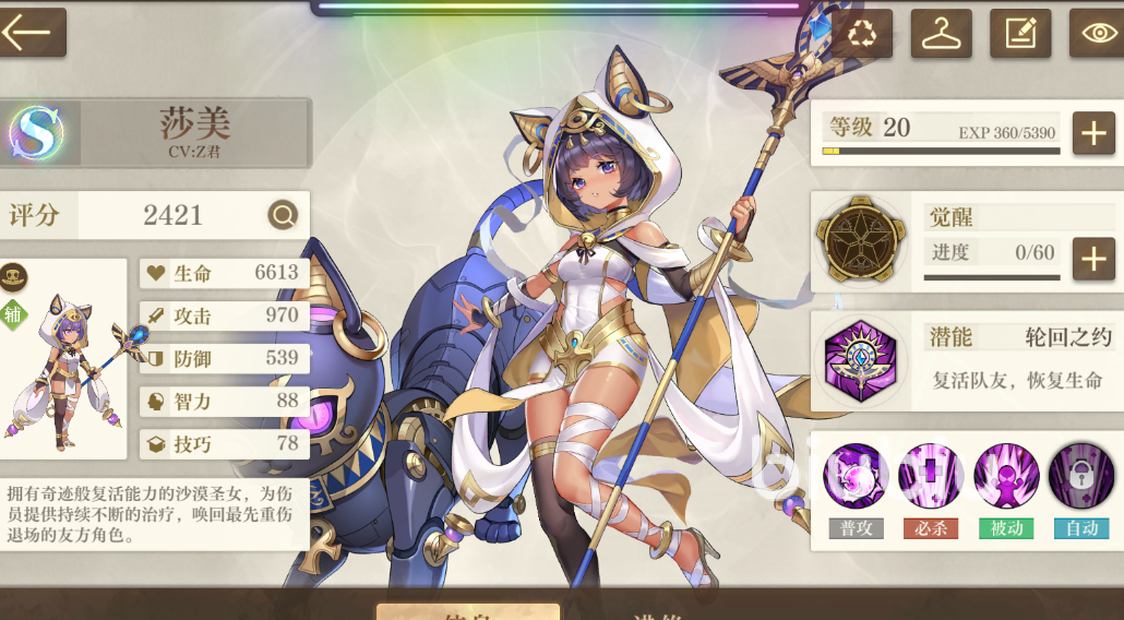 最后是一个辅助治疗,莎美,因为不管是什么队伍,都是需要一个治疗的,而莎美则是这款游戏里最好用的奶妈之一,不仅可以治疗队友,她的潜能“轮回之约”还可以复活队友并恢复生命,所以只要她不是最先死的,队伍相当于拥有一次复活机会。