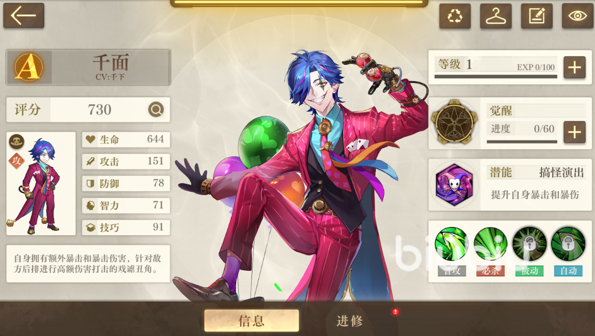 最后一个推荐的是千面,他需要玩家进行招募获得,是一个输出型的角色,他的暴击跟爆伤都很高,且可以针对敌方后排精准打出高额伤害,并且他的潜能“搞怪演出”也可以给他提升暴击与爆伤,让他战斗力更强。