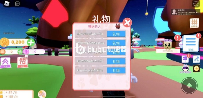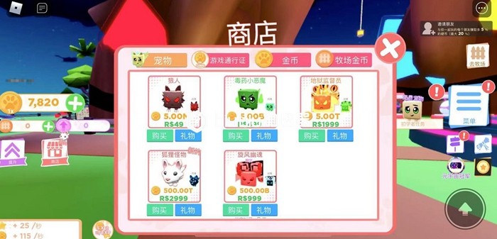 进入地图游戏之中,我们可以看到左侧有一个商店入口,点击商店并且进入之后可以看到宠物的购买界面。目前的版本中可以在商店购买的宠物有狼人、毒药小恶魔、地狱监督员、狐狸怪物以及旋风幽魂,在想要购买赠送给好友的宠物下方点击礼物会弹出在这个服务器地图有角色数据的好友列表,点击右侧的礼物就可以自动购买宠物并且赠送给好友了。