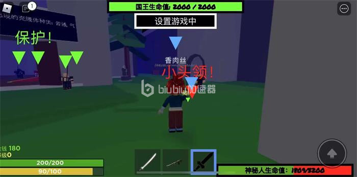 进入游戏后玩家就可以看到这个游戏自动配套的三把武器,第一个是武士剑,第二个是火箭炮,第三个是黑色大剑。目前第二个武器火箭炮不能使用,所以说玩家可以在第一格武器武士剑,和第三个武器黑色大剑之间选择。选好后,只需要点击下方武器图标,就可以成功佩戴了。