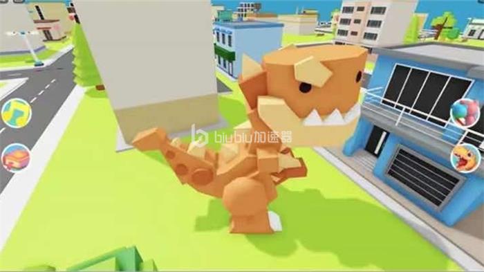 恐龙模拟器主要是玩家变身成为恐龙,然后吃掉建筑物,让自己升级变大。左下角就是游戏的手柄,操控恐龙移动,前往恐龙镇有大量的建筑可以用来吃掉升级,只要恐龙触碰到建筑就会自动吃掉,需要注意的是恐龙只能吃掉和自身差不多的建筑物,升级变大后才能吃更大的建筑物。