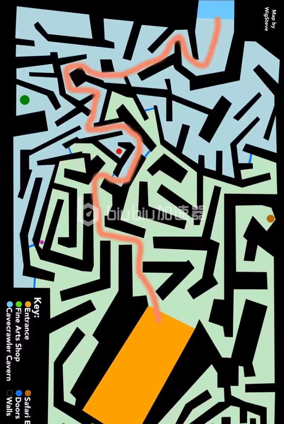 小编走了好几次,找到一条最简单的路线推荐给大家(如图),这条路线需要砸开一面墙,可以用鲨鱼斧砸开,也可以用炸药炸开。
