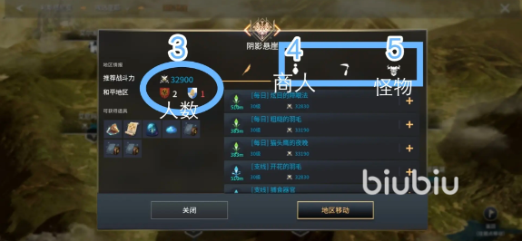 首先我们到达一张新地图时,可以点击左上角的地球图标,点开后会展现世界地图,在这里点击我们当前所在的位置地图,再点击当前所在的场地区域,如下图所示就能直观查看到当前所在地区的人数、商人以及怪物。
