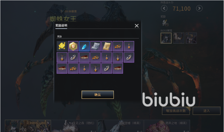 第二个是随机副本,一般是4人组队参与,包含了佣兵系统的自动匹配,2次基础奖励,额外消耗道具能获取3次;这里主要有首饰、武器装备,首饰和武器强化石,金币,设计图,精英副本券,坐骑这些。