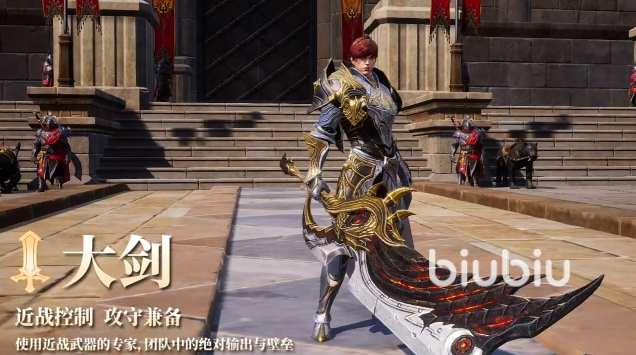大剑的生命值与防御力都比较高,攻击范围大的同时伤害可观,即可以在前方承伤,又可作为团队的近战输出来打出不俗的伤害,在各种团队和副本中都有不错表现,他的“风暴”会用回旋的方式对周围敌人造成伤害,“处刑”会挥舞武器进行攻击,并使得敌军陷入到昏厥之中,此招打出的伤害量会伴随蓄力时间而增加,他的“愤怒爆发”能对周围敌人造成伤害,在限定时间内大幅减少自己所遭受的伤害,并且使用时能无视限制来行动,他的“复仇”会在受到伤害时,有一定几率强化下一次的基本攻击产生更多愤怒值,并回复生命力。
