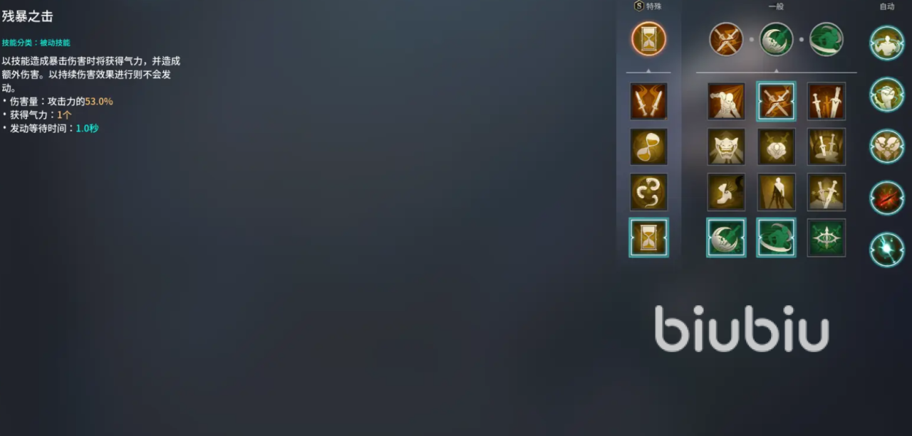 他的“利刃风暴”会朝着敌军突进,并引发出血效果,他的“乱刀”会消耗自己所有的气力,打出一次强力伤害,他的“残暴之击”会在用技能造成暴击伤时获得气力,并引发一次额外伤害,若是持续伤则不会发动。
