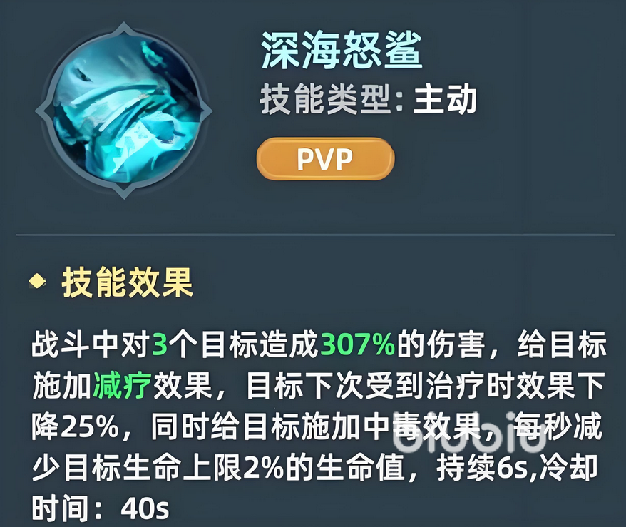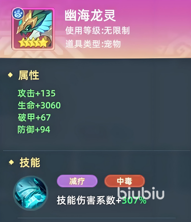 幽海龙灵是大家在宠物招募过程中可以直接抽取到的MR级别宠物,当然概率方面比较低,需要很好的运气才可以抽到。它的技能是深海怒杀,属于主动类型,效果是在战斗中对三个目标造成伤害,并给目标施加减疗效果目标,下次受到治疗时,治疗效果会下降25%。还可以给目标施加中毒效果,对方中毒之后每秒钟按照生命上限2%去减少血量,持续6秒钟,冷却时间40秒。