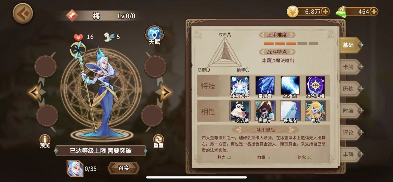 3、梅,橙色级别角色,冰队输出法师,主要技能造成敌方伤害以及技能可以连击还能给敌方增加冰霜层次。